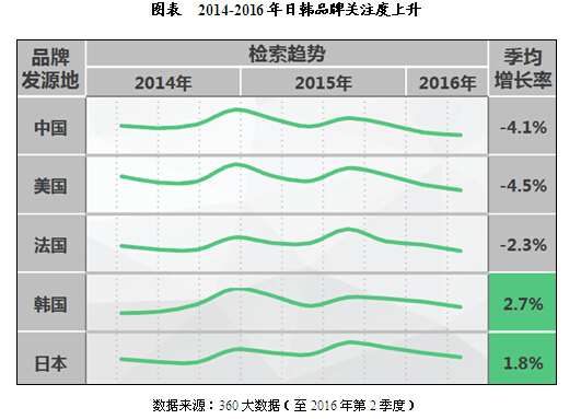 此外,從發展趨勢看,2014-2016年,日韓品牌的關注度增速最快。