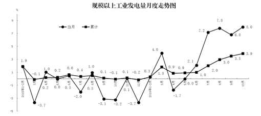 10月份,規(guī)模以上工業(yè)發(fā)電量同比增長8.0%,增速比上月加快1.2個百分點。1-10月份,規(guī)模以上工業(yè)發(fā)電量同比增長3.9%,比上年同期加快4.0個百分點。