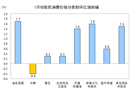 1月份,全國居民消費價格總水平環(huán)比上漲1.0%。其中,城市上漲1.0%,農(nóng)村上漲0.9%;食品價格上漲2.3%,非食品價格上漲0.7%;消費品價格上漲1.0%,服務(wù)價格上漲1.0%。