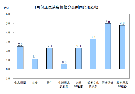 1月份,其他七大類價格同比均有所上漲。其中,醫(yī)療保健、其他用品和服務(wù)、教育文化和娛樂、居住、交通和通信、衣著、生活用品及服務(wù)價格分別上漲5.0%、4.8%、3.3%、2.3%、2.3%、1.1%和0.6%。