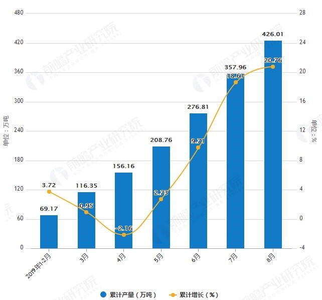 據國家統計局統計數據顯示,2019年1-2季度湖南省飲料產量有所增長,2019年7月湖南省飲料產量為59.91萬噸,同比增長21.08%。2019年1-8月湖南省飲料產量為426.01萬噸,同比增長20.76%。